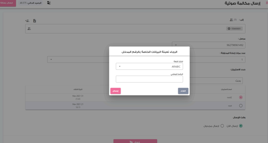 في هذا القسم، يمكنك إرسال المكالمات الصوتية إلى مجموعات جهات الاتصال، كما يمكنك إرسالها أيضًا إلى أرقام لا تنتمي إلى أي مجموعة. بإمكانك التحكم في الاستبيانات الصوتية، رفع الملفات الصوتية، وعرض المكالمات الصوتية الصادرة.