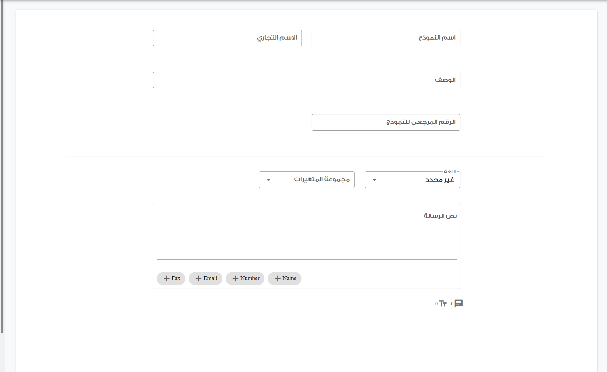 - بعد تعبئة خانة اسم النموذج ، الاسم التجاري ، الوصف، الرقم المرجعي للنماذج من ثم اختیار اللغة و كتابة نص الرسالة اختیار أیقونة " حفظ ".