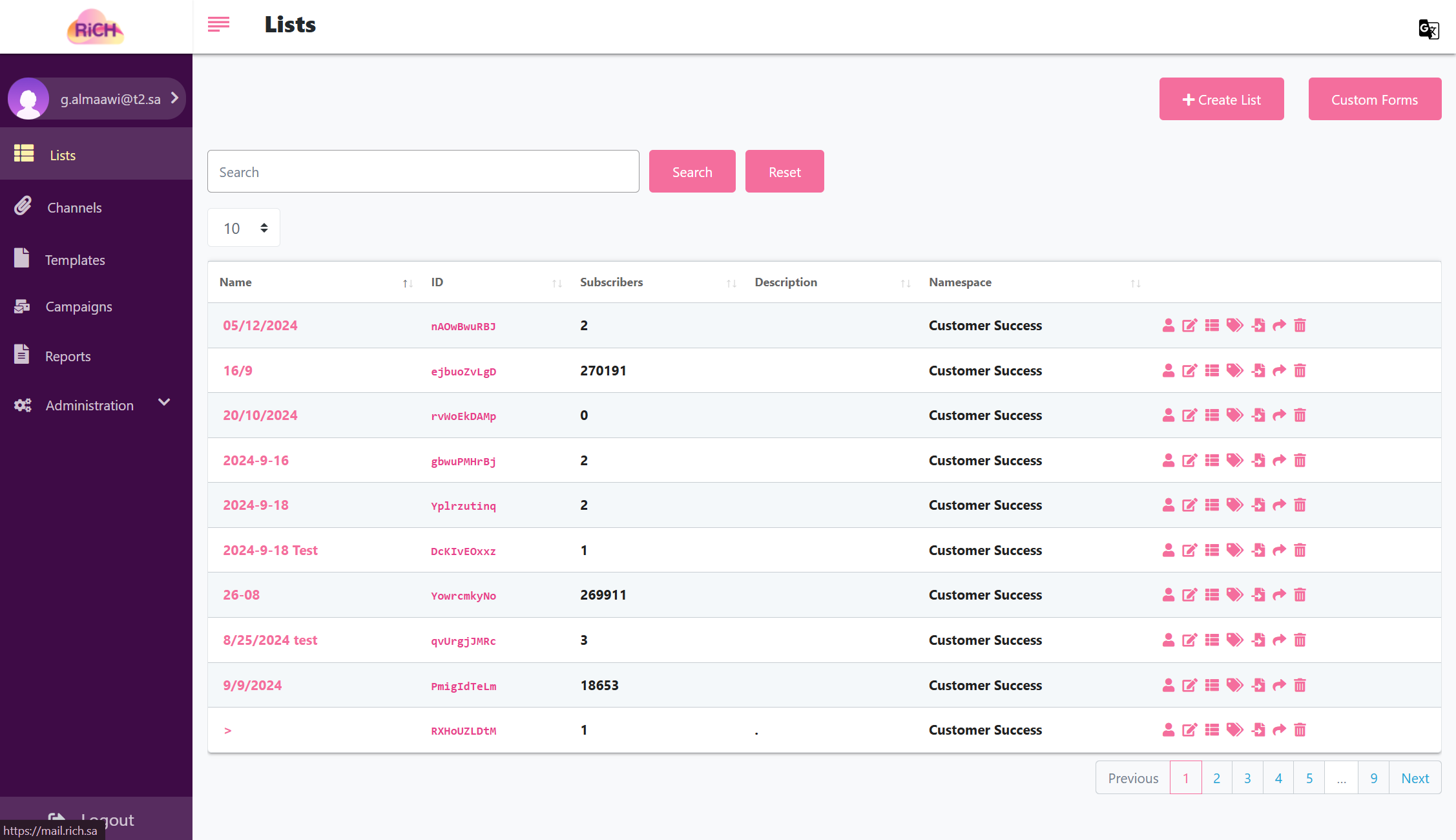To create forms used for group subscriptions, click on "List", and the list page will appear as follows:
