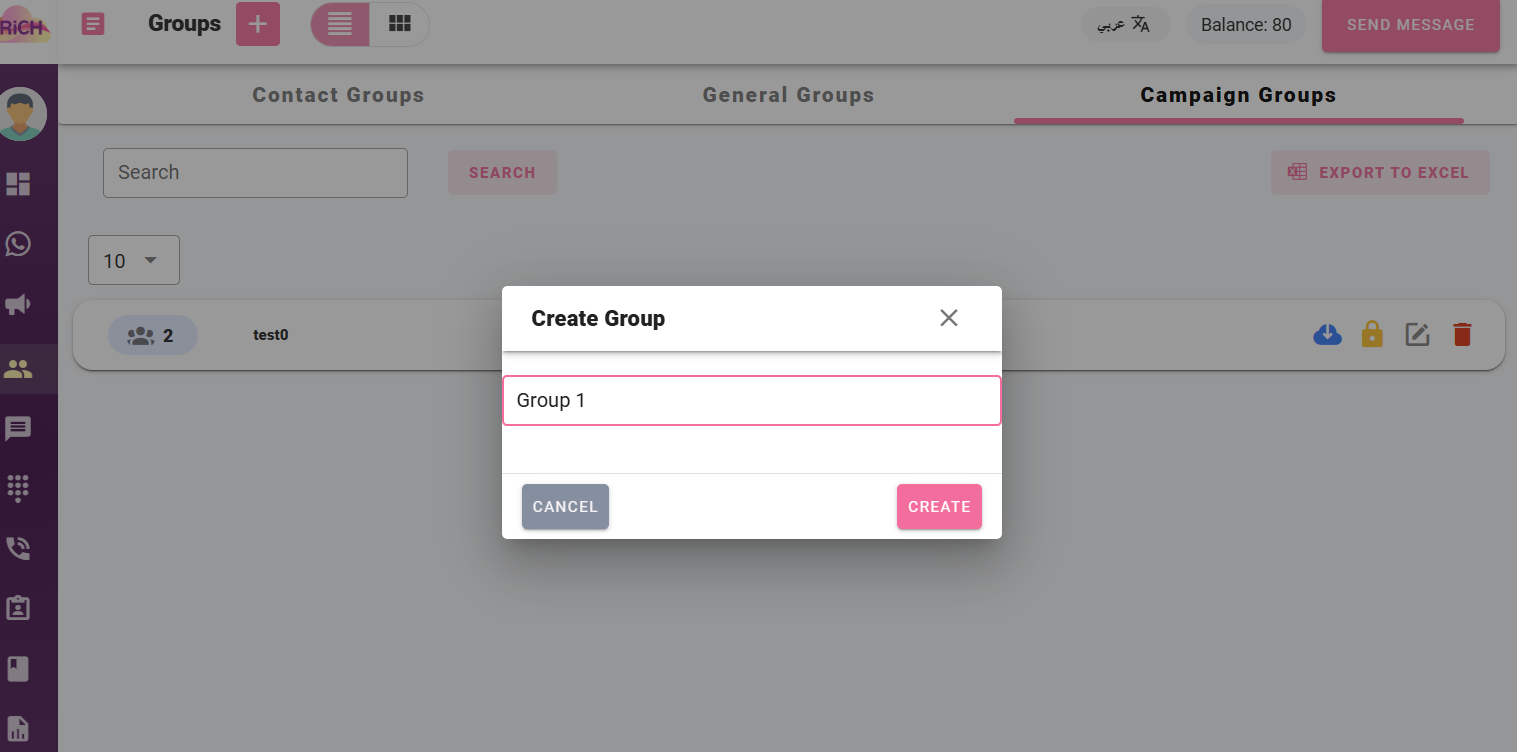 This page allows the user to create groups that contain a large number of contacts by uploading a file with mobile numbers to the system. These groups are used for sending mass text messages and voice calls.
